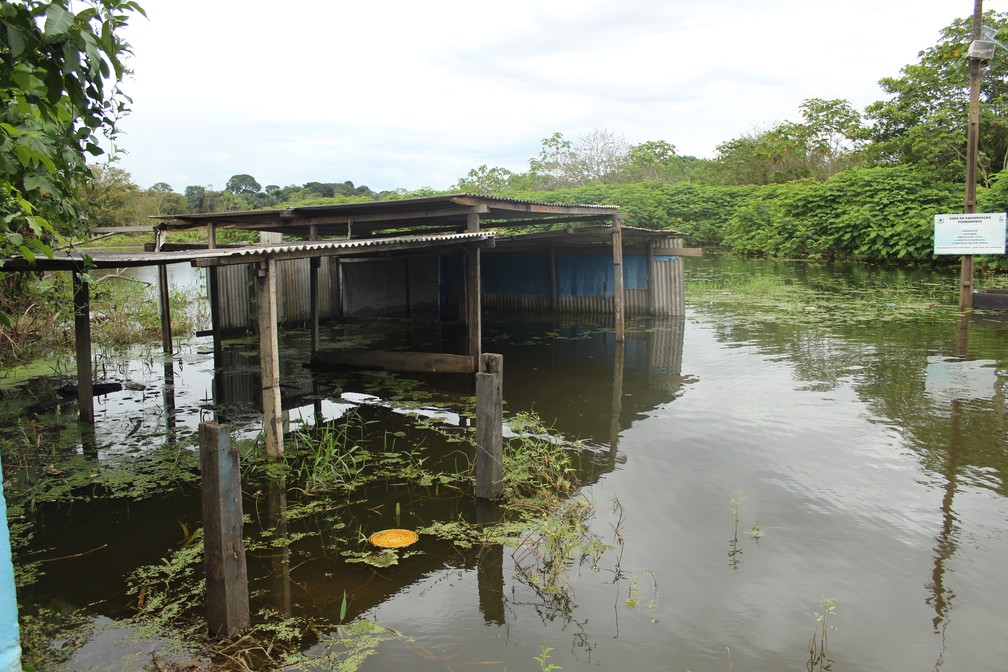 Estrutura de campo de futebol alagada pela água de canal ligado ao rio Madeira, em bairro da região central de Porto Velho. — Foto: Pedro Bentes/G1