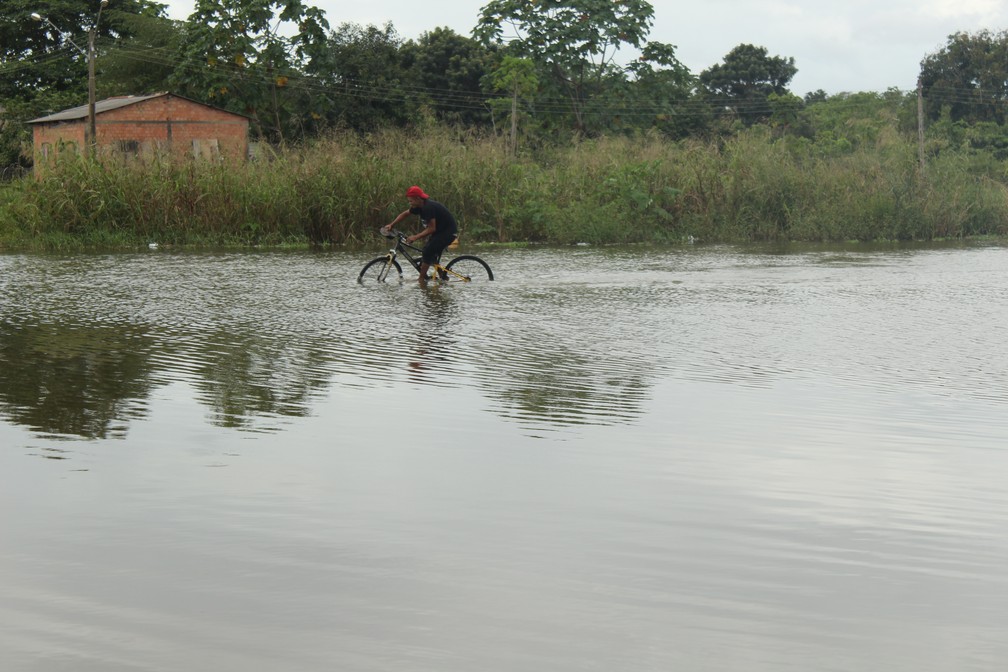 Moradora equilibra bicicleta em ramal alagado pela água do rio Madeira, em Porto Velho. — Foto: Pedro Bentes/G1