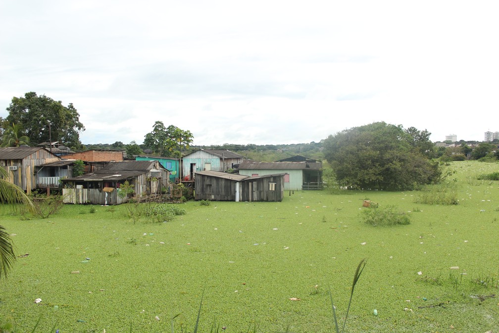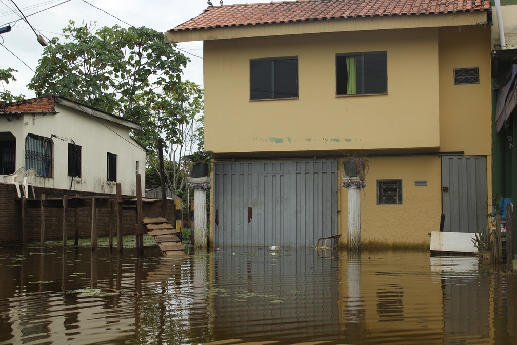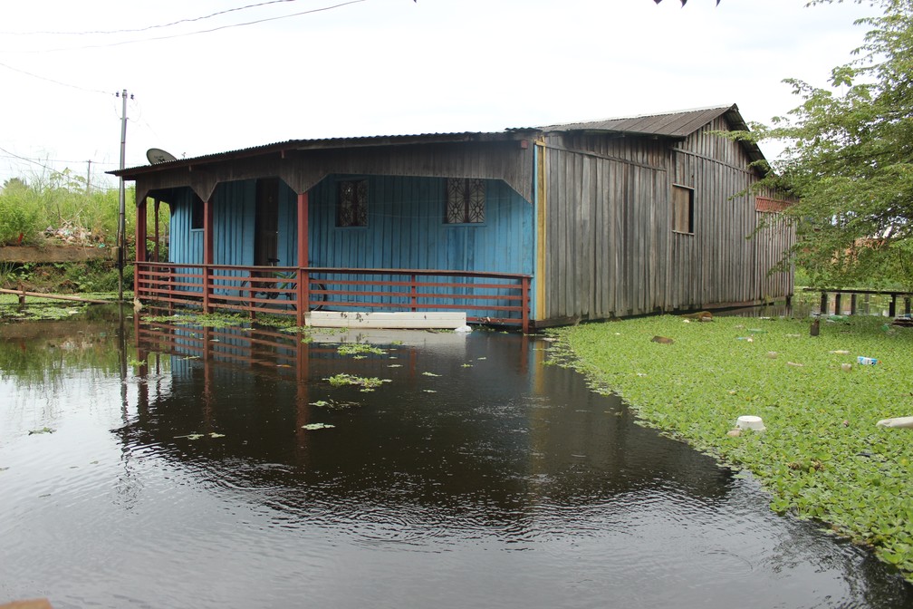 Casas na região central de Porto Velho já sentem os efeitos do aumento do nível de canais ligados ao Rio Madeira. — Foto: Pedro Bentes/G1