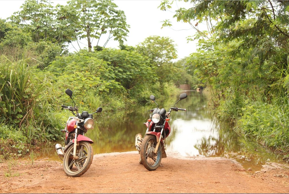 Duas motos desistem de atravessar estrada de terra tomada pela água. — Foto: Pedro Bentes/G1