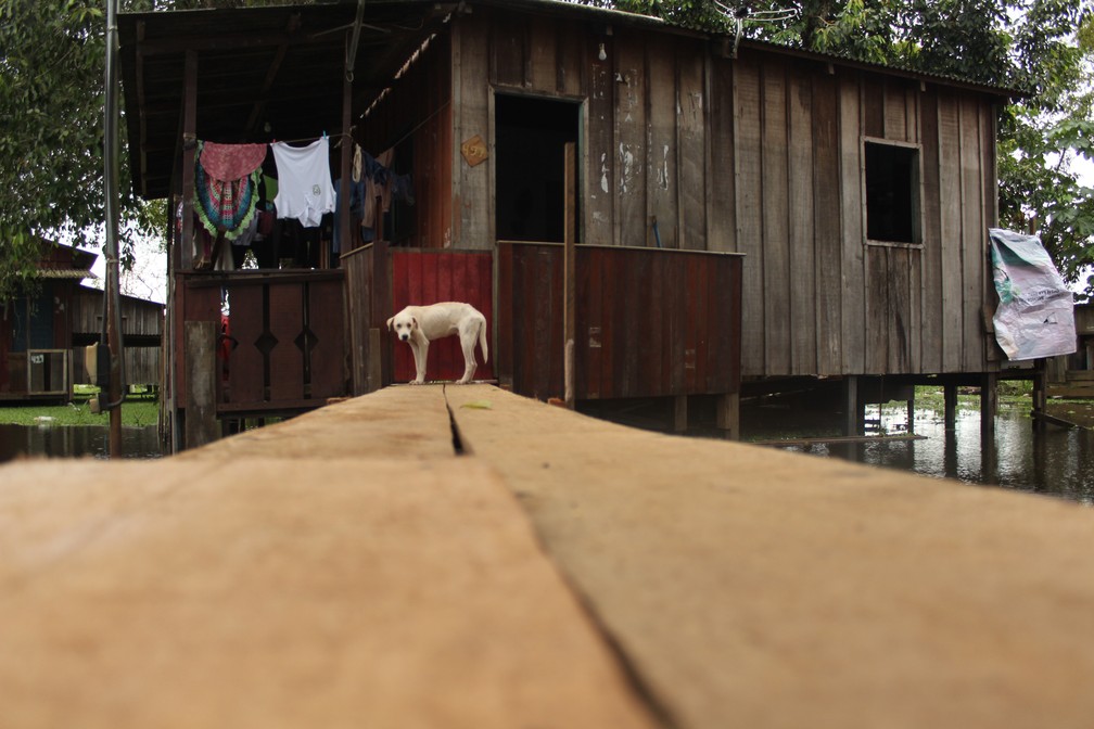 Cachorro em uma casa ilhada por canal ligado ao rio Madeira, em Porto Velho. — Foto: Pedro Bentes/G1