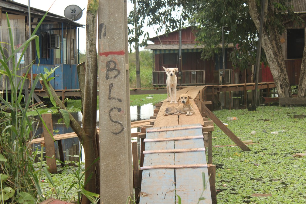 Cachorros ficam ilhados pela água de atingiu ramal em Porto Velho. — Foto: Pedro Bentes/G1