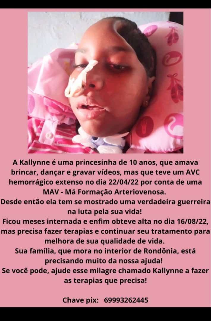 Mais informações sobre a situação de Kallyne, podem ser obtidas pelo telefone 69 99326-2445, com Luana Maria Santos Vieira, que é a mãe da menina.