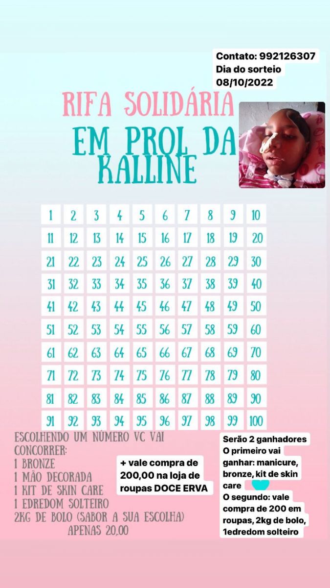 “A Kallyne precisa fazer fisioterapia (afasia e disfasia), fisioterapia motora, fisioterapia ocupacional e fisioterapia pulmonar. Não podemos saber quanto vai custar tudo isso, pois, não temos um valor final, já que não sabemos também quanto tempo vai levar o tratamento. Estamos com publicações no Facebook e Instagram, além de pedir ajuda para os amigos. Toda a ajuda fará a diferença para ela”, explicou.