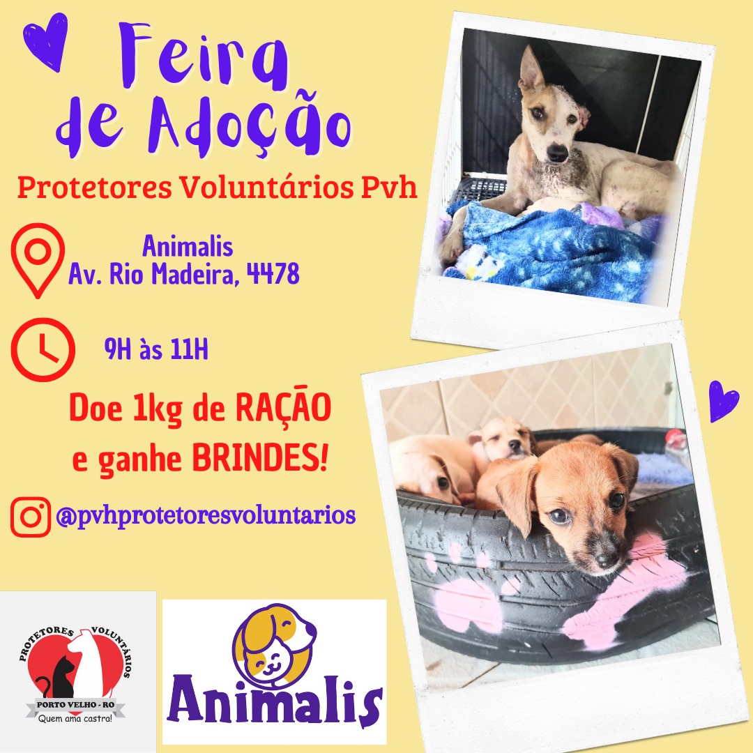 Quem não puder ir à Feira de Adoção poderá fazer doações de qualquer valor por meio da chave PIX pvhprotetoresvoluntarios@hotmail.com.